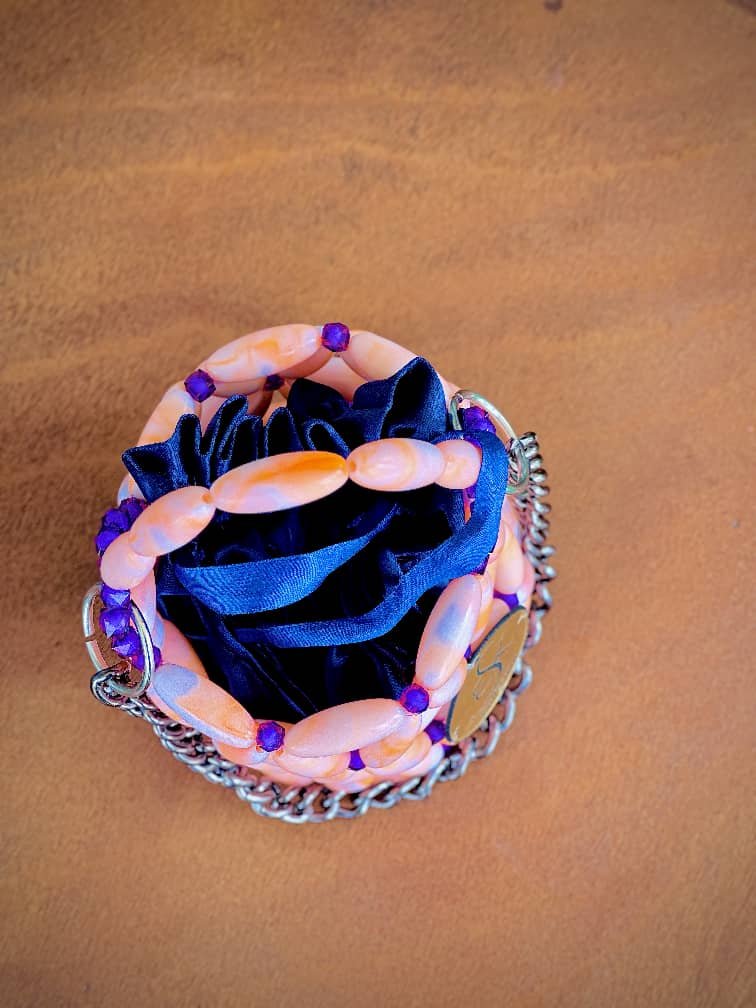 Sac perlé africain Ayala fait main. Mini sac seau chic rose pêche et violet, parfait pour soirées, événements et looks élégants.