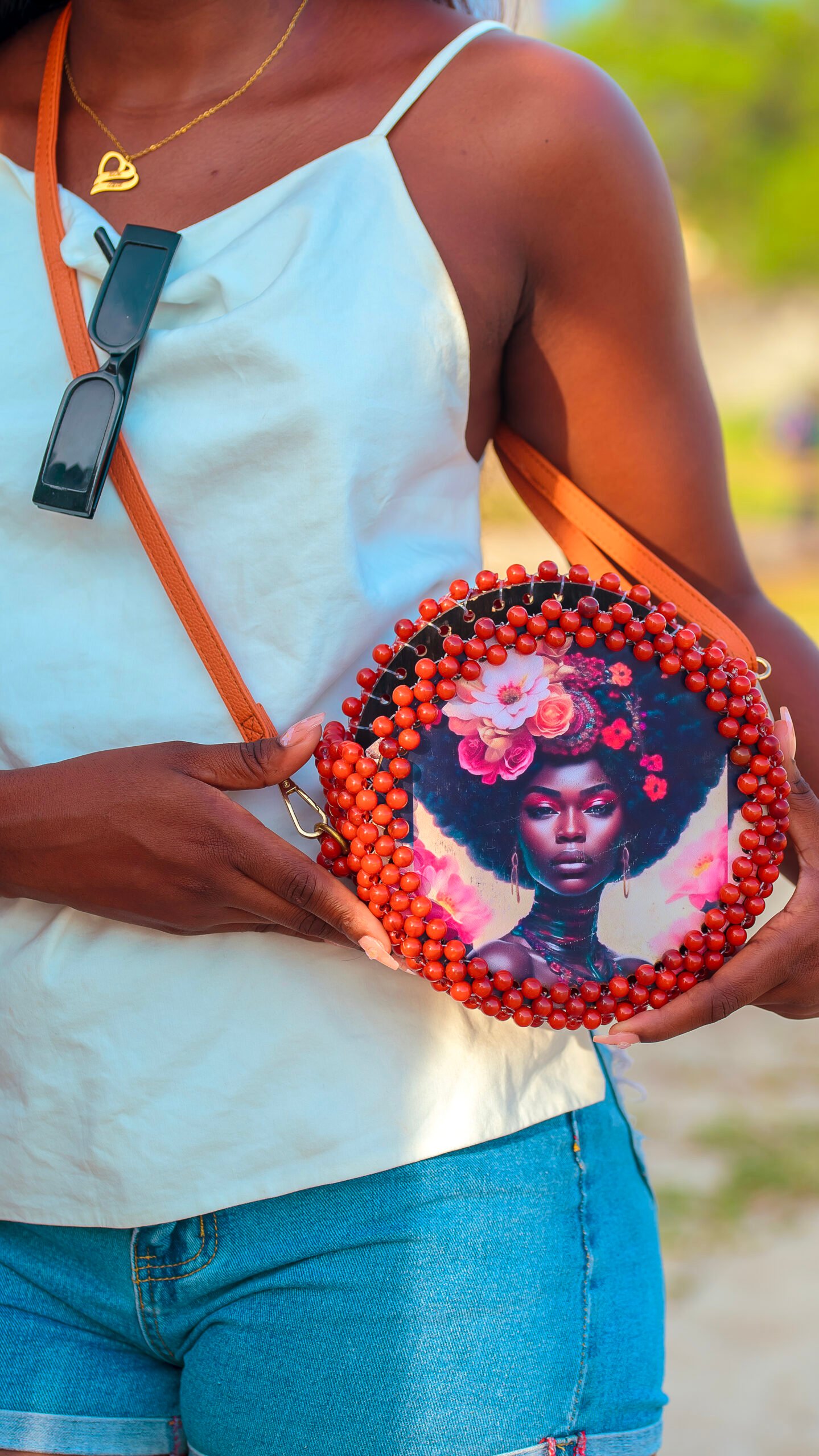 Au centre, un insert décoratif imprimé au motif floral artistique apporte une touche contemporaine qui contraste harmonieusement avec le travail traditionnel du perlage. Le résultat est un accessoire fort, capable de transformer une tenue simple en look sophistiqué.
